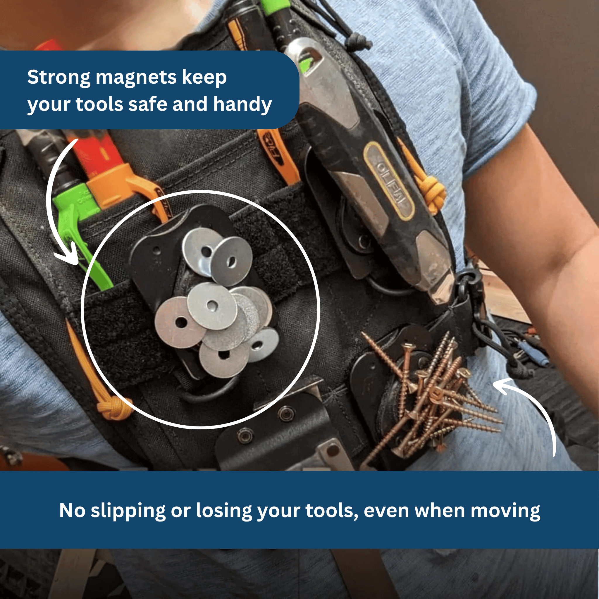 The tool holder features extra-strong magnets that securely hold tools such as screwdrivers, pliers, nails, or even hammers.