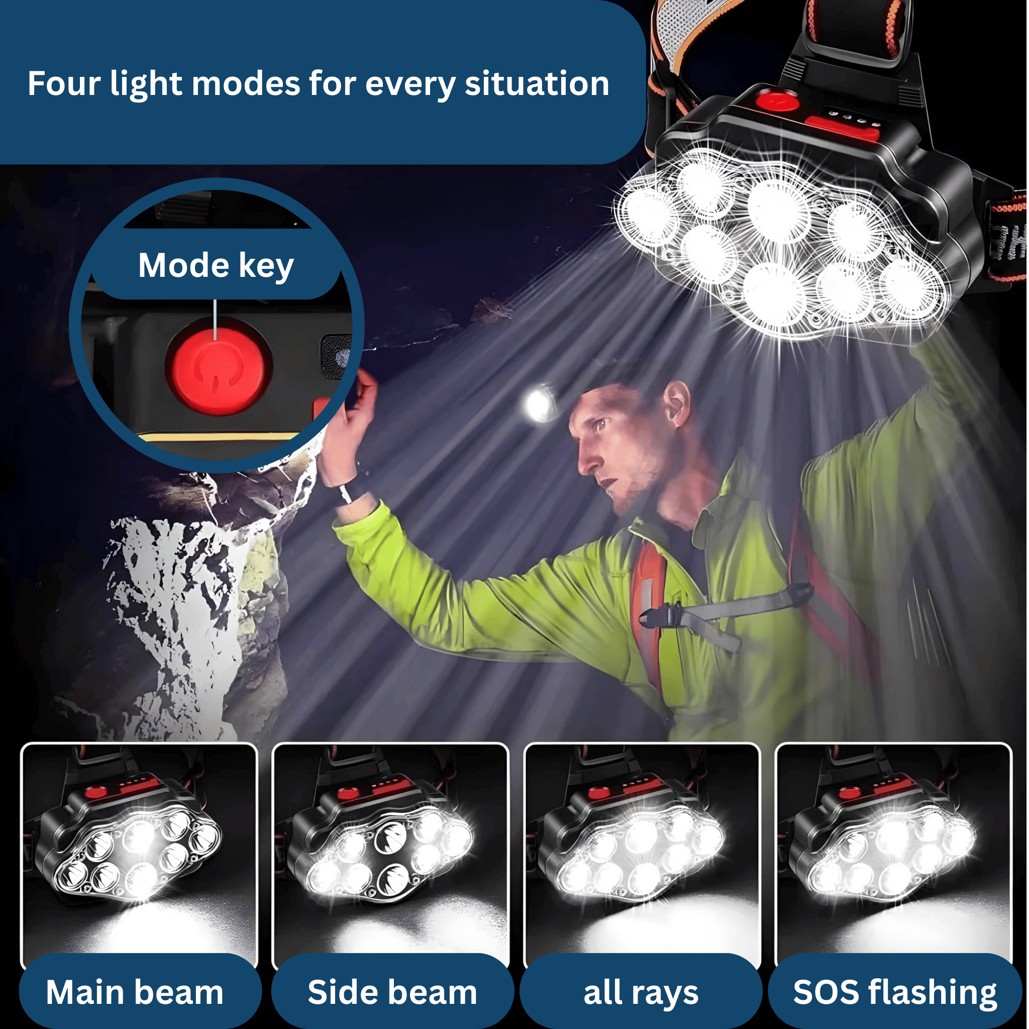 The headlamp offers four light modes: the main beam for targeted visibility, the side beam for wide illumination, the overall lighting mode for maximum visibility, and an SOS flashing light for emergencies.