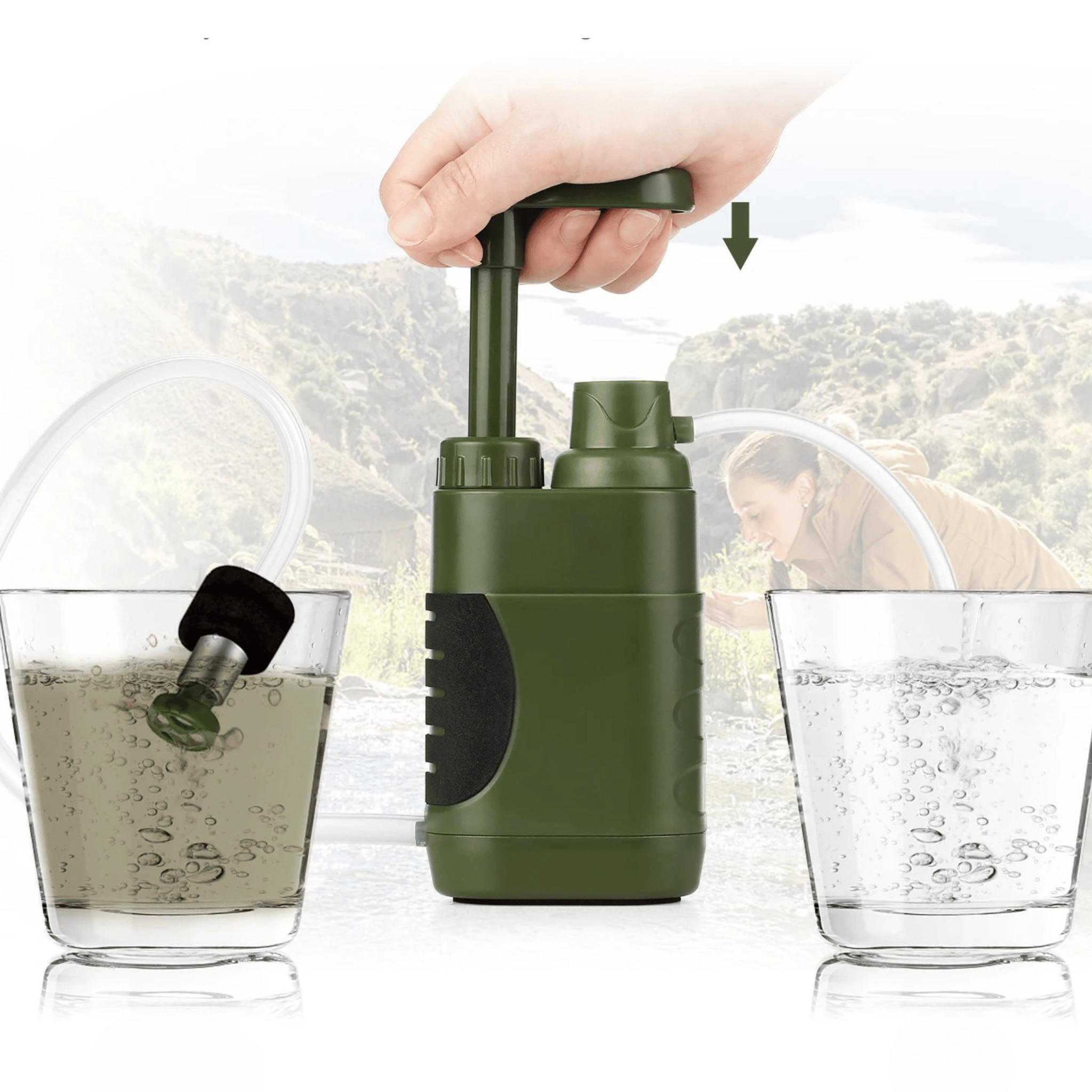 The hand pump pushes the water through all filter stages, purifying it within seconds.