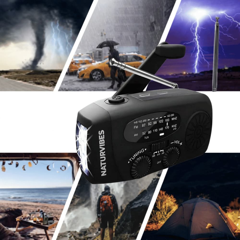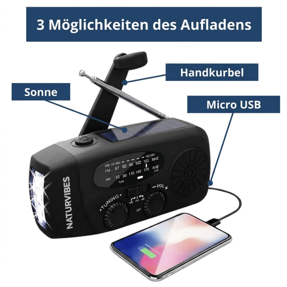 Nur der NaturVibes Strom-Safe PRO vereint Stromerzeugung, Radioempfang und Taschenlampe in einem ultrakompakten Notfallgerät.