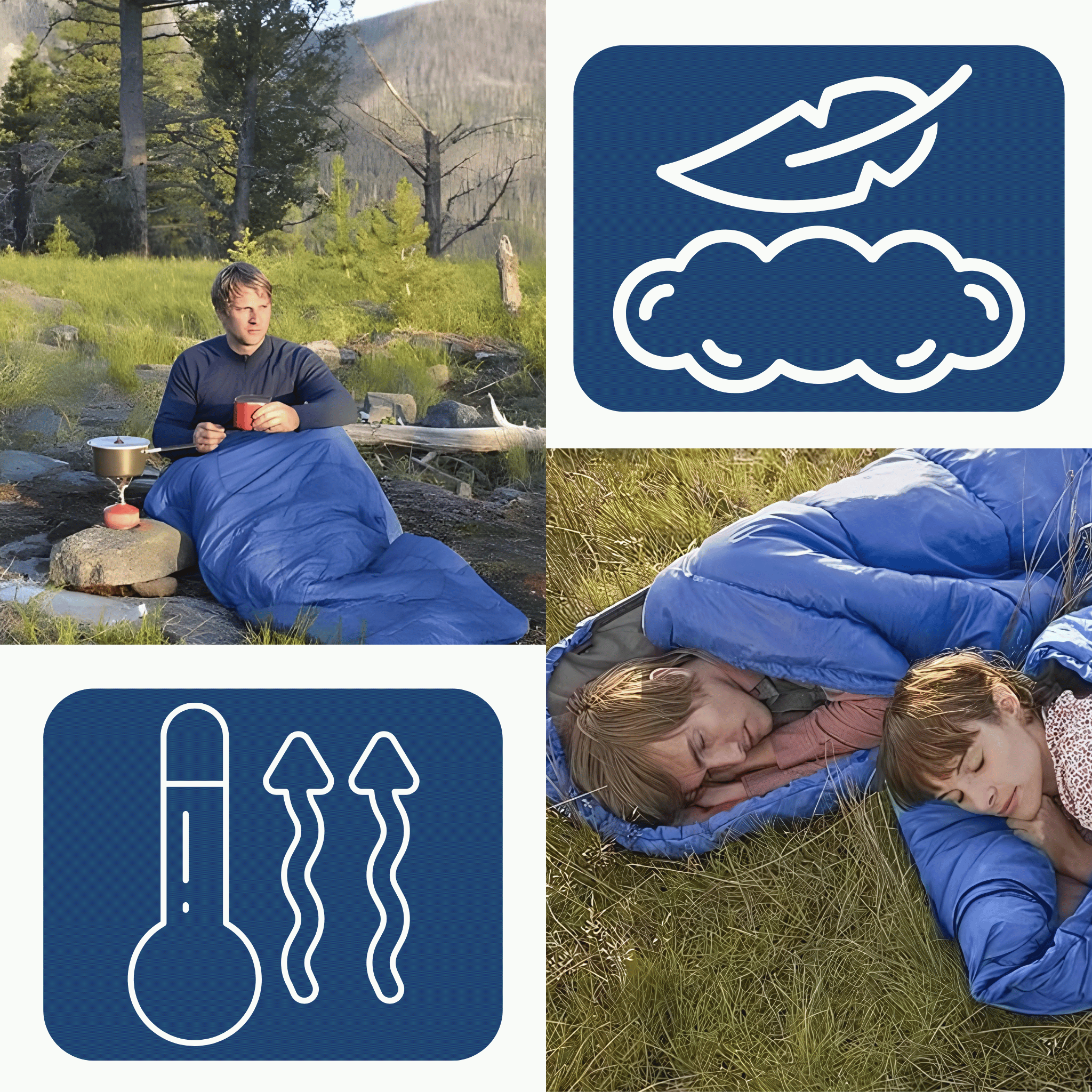The sleeping bag is ideal for temperatures of 59–77 °F and provides comfortable warmth and restful sleep, even in cooler nights.