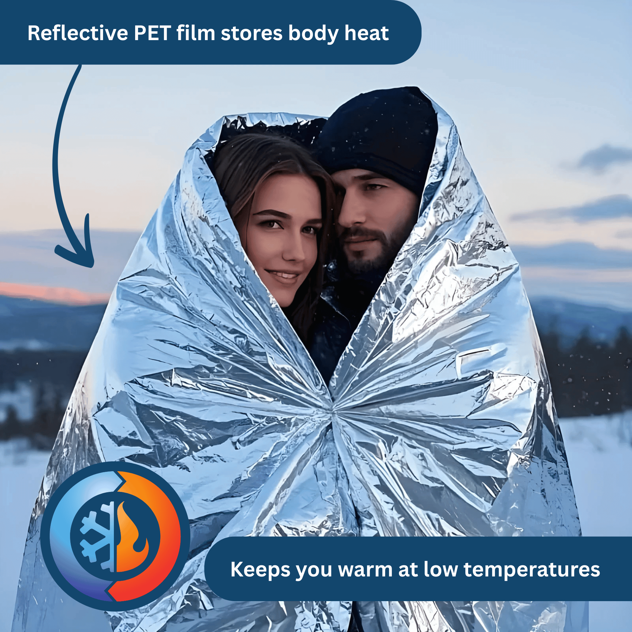 The blanket is made of reflective PET film that traps up to 80% of your body heat, helping you stay warm and protected in low temperatures.
